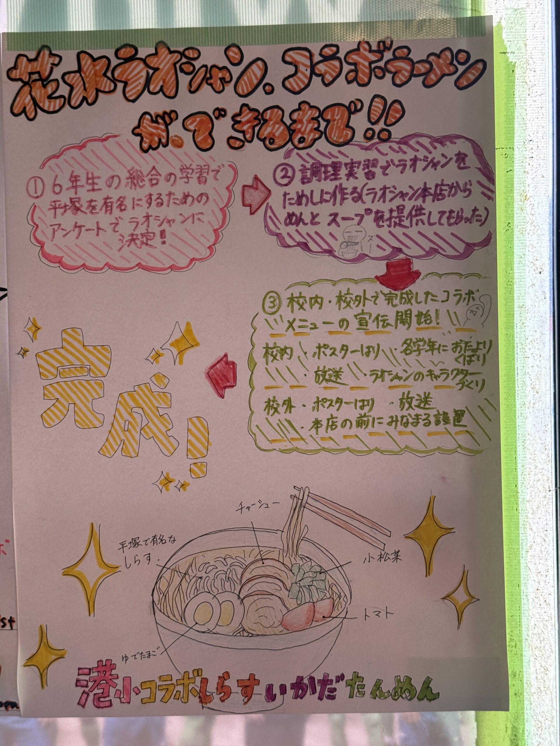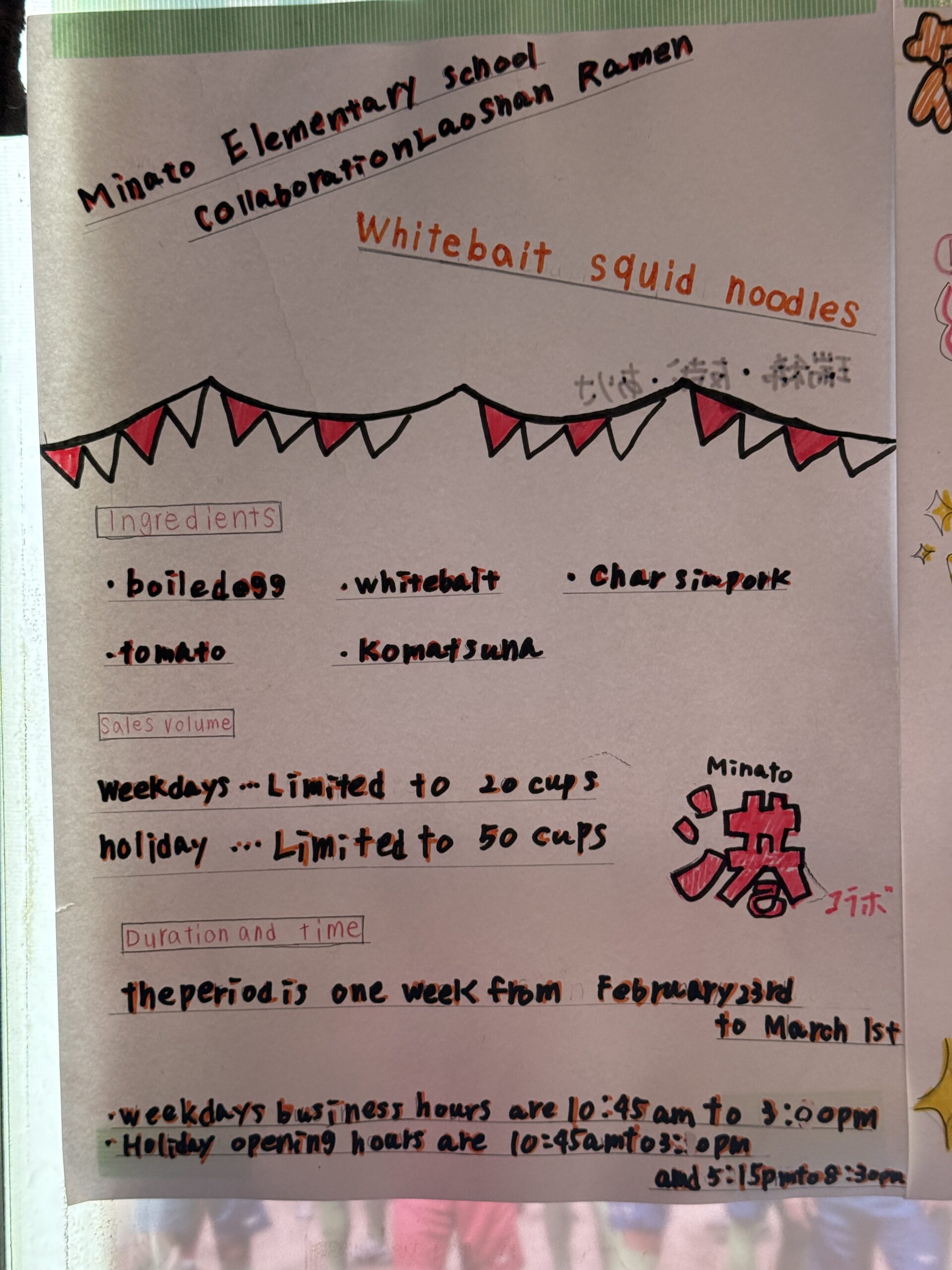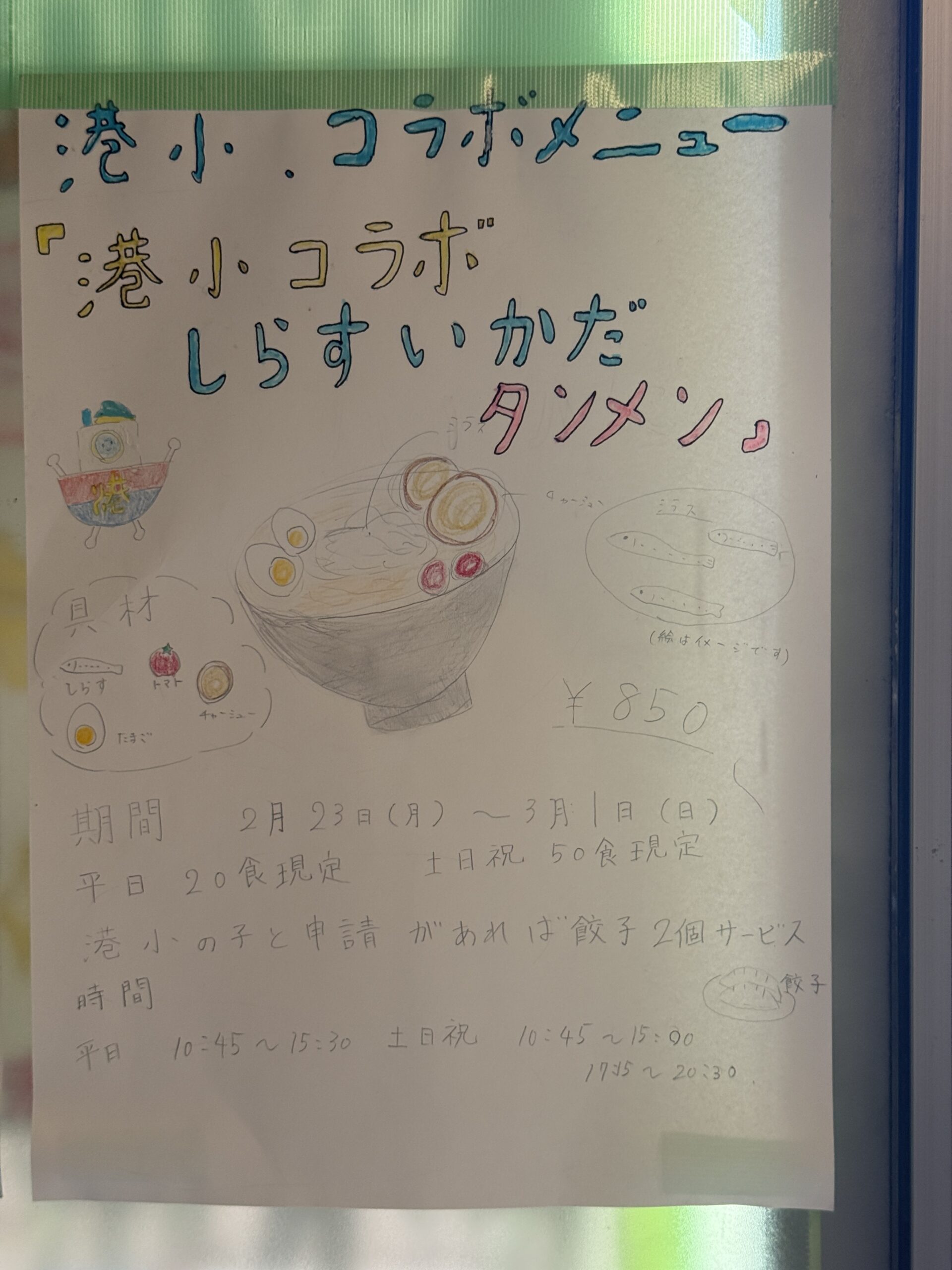 期間限定・港小コラボしらすいかだタンメンのお知らせ 2月23日から3月1日(日)まで “港小コラボしらすいかだタンメン”を販売いたします! 平塚市立港小学校6年生のみなさんに たくさんのアイデアを出していただき、 一緒に考案した特別メニューです✨ 【数量限定】 *平日:20食限定 *土日祝日:50食限定 店内には、お店を紹介してくれたポスターや コラボタンメンのオブジェも掲示しております。 ぜひそちらもご覧ください! 港小6年生のみなさん、 本当にありがとう♡ Tweet